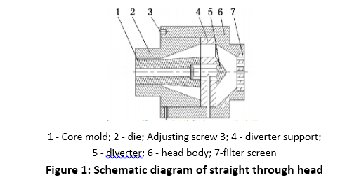 Hovedet er generelt sammensat af hovedlegeme, omleder, omlederstøtte, justeringsskrue, kernematrice, dyselæbe osv. typerne afrørekstruderingshoveder generelt opdelt i lige gennemgående type, retvinklet type, excentrisk type, spiraltype og skærmkurvtype. Det lige gennemgående hoved er det mest almindeligt anvendte, og dets struktur er vist i figur 1. Hovedet kan opdeles i følgende tre dele: Hovedkroppen og omlederen udgør den første del af hovedet, det vil sige præformsektionen; Kompressionssektionen af omlederstøtten, matricen og kernen danner den anden del af hovedet, det vil sige kompressionssektionen; De lige sektioner af matricen og kernen danner den tredje del af hovedet, det vil sige formningssektionen.