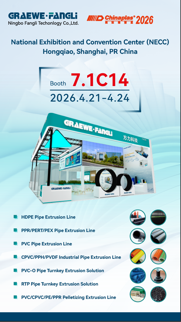 मराठी Velkommen til vores stand 7.1C14 på ChinaPlas 2026,Ningbo Fangli Technology Co., Ltd.(herefter benævnt "Fangli") har specialiseret sig i R&D, produktion og salg afplastekstruderingsudstyr, nye miljøbeskyttelsesproduktionslinjer, plastrørssvejsemaskiner og plastikhjælpemaskiner.